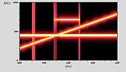 - een sweepsinus van 200 Hz bij het begin van het signaal tot 700 Hz op het einde. Een sweepsinus is een sinus waarvan de frequentie in de loop van de tijd verandert.