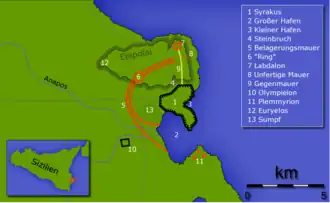 Beide zijden begonnen daarop muren te bouwen. De Atheense muur, genoemd "de Cirkel", was bedoeld om Syracuse af te sluiten van de rest van het eiland, terwijl Syracuse een aantal omwallingen als verdediging bouwde vanuit de stad ten opzichte van de Atheense forten.