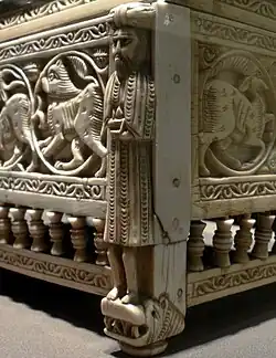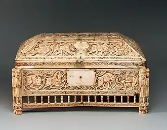 - ↑ a b Op de tentoonstelling "Het jaar 1000" in het Rijksmuseum van Oudheden in Leiden (2023-2024) werd het ivoren kistje gepresenteerd als "Zuid-Italië of Sicilië, 1000-1100". Foto op Wikimedia Commons.