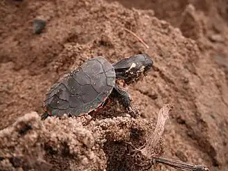 In het noorden van het verspreidingsgebied blijven de juvenielen in het nest om pas het volgende voorjaar te verschijnen.[15] Zie ook onder het kopje overwintering. Als de eieren onder ideale omstandigheden worden gehouden, zoals in een broedmachine, komen ze na ongeveer 50 dagen uit. De kleine schildpadjes hebben bij het uitkomen een schild van ongeveer 2,5 centimeter lang. Het schild is rond en niet ovaal zoals bij de volwassen dieren. Op het midden van het schild is een kiel aanwezig, die loopt over het nuchale schild aan de voorzijde en het midden van alle vertebraalschilden. De kiel tot aan de marginaalschilden aan de achterzijde van het schild. De juvenielen van twee ondersoorten hebben een knalrode tekening op het buikschild (plastron) en de onderzijde van de schildrand, waaraan ze makkelijk te herkennen zijn. Bij oudere dieren wordt deze tekening en de kleur wat vager, maar verdwijnt nooit helemaal. De jonge schildpadjes eten veel en groeien snel, na een jaar zijn ze twee keer zo groot.[6]