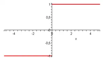 Grafiek van de signumfunctie (let op de nulwaarde in de oorsprong )