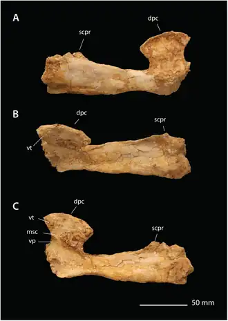 Het opperarmbeen is zeer robuust met een driehoekige dwarsdoorsnede van de onderste schacht. De beenstijl van de deltopectorale kam loopt uit in een bultje aan de top. Over de nek van de kam loopt een richel van zijde lichaam richting onderarm.