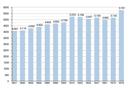 - Bronnen:NIS, Opm:1831 tot en met 1970=volkstellingen; 1976 = inwoneraantal op 31 december