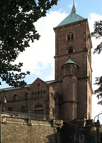 Adalbert stierf in 997 en werd in 999 heilig verklaard. Keizer Otto III, bevriend met Adalbert, bracht onder meer ook enkele relikwieën van deze heilige naar Aken en stichtte daar een kapittelkerk, na de Dom van Aken de oudste kerk van deze stad. Deze moest goed zichtbaar zijn en werd daarom op een rots gebouwd welke uit Condroz-zandsteen bestond welke in het Boven-Devoon werd afgezet. Het was een driebeukige basilicale kerk, waaronder zich een crypte bevond. In de crypte werden de missen voor de parochie opgedragen; de kerk zelf was bestemd voor de kanunniken van het kapittel.