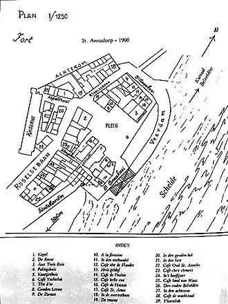 Centraal stond het Sint-Annaplein dat toegang gaf tot de veerdam. Daar legde de veerboten aan om karren en passagiers over te steken van en naar Het Steen in Antwerpen. Zuidelijk van het veerdam was er de Sint-Annakaai waar de mosselboten aanlegden. Met paard en kar werd er over een schans gereden tot naast de boten, om de lading over te laden[6].
