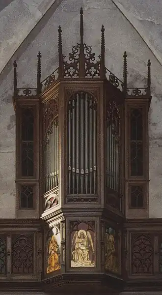 Het orgel heeft een bescheiden front waaraan duidelijk te zien is dat het voor een kapel is gebouwd. Het geheel -orgel, kas en windvoorziening- is onaangetast en origineel. Boven de lessenaar is een koperen cartouche aangebracht met de tekst Uit dankbaarheid/A.M.H.O.v.Rooijen/en/J.A.G.Wessels/St. Pieter bij Maastricht/october 1898. Waarschijnlijk worden hiermee de gevers van het orgel aangeduid.[1]