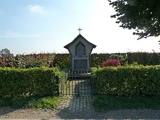 De kapel bestaat uit een taillevormige pilaar waarin een nis is aangebracht en wordt gedekt door een geknikt zadeldak. Het bouwwerk is deels in beton en deels in baksteen gebouwd en staat op een bakstenen platform. Van de grond af aan wordt de kapel eerst smaller, na het midden wordt het weer breder en daarboven het zadeldak. Op dit betonnen zadeldak staat een metalen kruis. De frontgevel bevat de kapelnis en eronder een (lege) rechthoekige nis en is uitgevoerd in beton. De randen van de frontgevel zijn uitgevoerd in baksteen, evenals de omlijsting van de kapelnis en de achterwand van de onderste rechthoekige nis. De zijgevels bestaan voor twee derde uit bakstenen (op de hoeken) met ertussen een strook uitgevoerd in beton. Op de rechter zijgevel is een plaquette aangebracht met de tekst:[2]