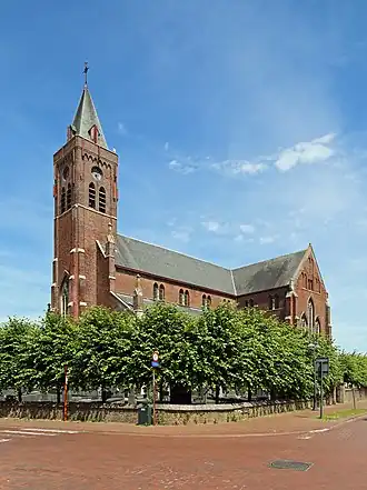 Het betreft een neogotische bakstenen basilicale kruiskerk met halfingebouwde westtoren. Boven het ingangsportaal bevindt zich een beeld van Dionysius.