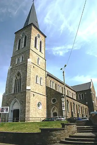 Het betreft een driebeukig kerkgebouw met vlak afgesloten koor en voorgebouwde westtoren, dit alles opgetrokken in natuursteen. In het portaal vindt men beelden van Sint-Gertrudis en Pepijn van Landen met zijn vrouw Itta.