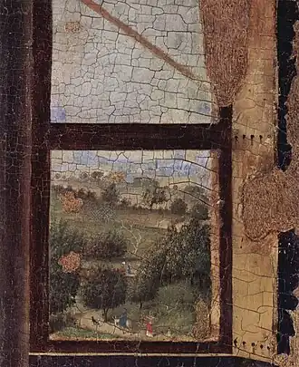 Het linker benedenvenster opent naar een miniatuurgroen landschap. Op de voorgrond van deze is, aan de rand van een rivier die horizontaal door de ruimte van het raam snijdt, een boom te zien aan de linkerkant, en twee figuren in zwarte jurk en witte hoofdtooi, vergezeld van een dier, vermoedelijk een hond. Op de rivier zitten twee figuren in witte gewaden en hoofddeksels in een boot, roeiend. Hun weerspiegeling in het water is zorgvuldig in beeld gebracht. Op de andere oever, naast een boom, staat een figuur in rode stip en zwarte hoed, die naar de roeiers lijkt te kijken. Misschien is het een visser. Verderop in het landschap bewegen twee figuren te paard zich op een kruispunt dat links een stad scheidt, omringd door witte muren en torens waaruit een puntige klokkentoren oprijst, en rechts een witte omheining die een tuin of een boomgaard beschermt. In de verte stijgen de heuvels.