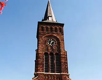 De toren van de kerk is 39 meter hoog. In tegenstelling tot de rest van het kerkgebouw is hier gebruikgemaakt van lagen gesinterde baksteen om de decoratieve waarde te verhogen. Deze zwarte banden komen sinds de restauratie van 2014-2015 opnieuw tot hun recht, hiervoor waren ze nog nauwelijks zichtbaar. De kerk bevat drie klokken, die van groot naar klein respectievelijk de tonen sol, la en do bezitten. Twee van de drie klokken zijn van 1953, de derde en kleinste klok (de zogenaamde angelusklok) is ouder.