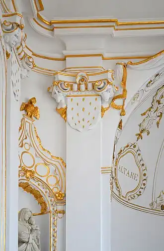 Het interieur bezit fraai stucwerk dat witgeschilderd is met gouden versieringen, deels in rococostijl. De ruimte wordt overwelfd door een spiegelgewelf. Aan de zijkant vindt men pilasters met Ionische kapitelen.