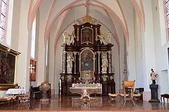 De in 1755 ingewijde kerk vormt de noordelijke afsluiting van het complex. De rechthoekige zaalkerk had oorspronkelijk als enige buitenversiering het Jezuïetenmonogram, dat later boven de zijvleugel van het kloostergebouw werd aangebracht toen de kerk rond 1900 een gotische klokkentoren kreeg. In dezelfde tijd werd ook het koor vergroot.