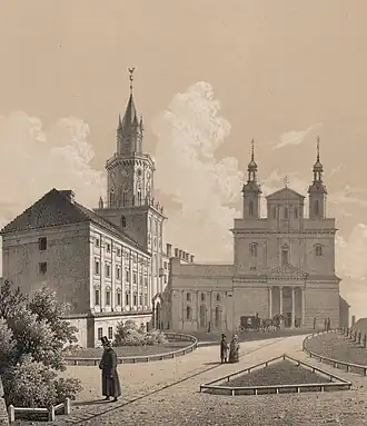 Na een brand in 1752 werden de bovenste verdiepingen van de beide torens en een voorhal gebouwd. Bij de oprichting van het bisdom Lublin in 1805 werd de kerk tot kathedraal bestemd. Tegelijkertijd werden de gebouwen van het jezuïetenklooster afgebroken. Sindsdien ligt de kathedraal aan een groot plein. In 1820 werd de classicistische zuilenporticus aangebouwd. De vroegere kloosterpoort uit de 17e eeuw werd tot een 40 meter hoge klokkentoren verbouwd. De toren draagt de naam Drievuldigheidstoren. Ook in het interieur werden aanpassingen uitgevoerd. Rijen kapellen verdelen de beide zijschepen.