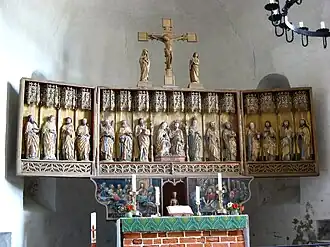 Het altaar uit het jaar 1487 betreft een laatgotisch altaar met vijf vleugels. Aan de buitenzijde van de vleugels bezit het altaar olieverfschilderijen met scènes uit het leven van de kerkpatroon Johannes de Doper. In geheel openstaande stand toont het altaar 16 beelden uit de christelijke iconografie. De centrale plaats wordt ingenomen door Maria, die door Christus wordt gekroond. Op grond van de belangrijke plaats van Maria in het altaar is er duidelijk sprake van een rooms-katholiek altaar. Vanuit het perspectief van de toeschouwer staat links van de kroningsscène een beeld van Sint-Jan en rechts een paus met een tiara op (mogelijk Silvester I). De overige beelden stellend de apostelen voor. Boven de altaaropzet is een kruisigingsgroep te zien. In de lege nis van de predella stond voor de reformatie de monstrans die tijdens de mis werd getoond. De beide schilderijen op de predella stellen de Voetwassing en het Avondmaal voor.