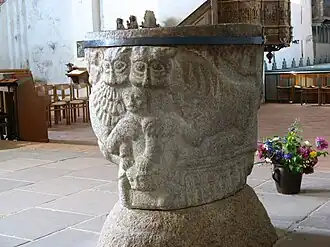 Het romaanse doopvont werd omstreeks 1200 van een granieten kei gemaakt en is het oudste voorwerp in de kerk. Het behoort kunsthistorisch tot de belangrijkere werken in Noord-Duitsland uit de romaanse periode. De forse ‘’cuppa’’ staat op een ovale sokkel. Er zijn twee reliëfs op aangebracht die de strijd tussen goed en kwaad om de ziel van de mens uitbeelden. Deze strijd kan alleen door middel van de doop in de naam van de drie-enige God worden beslecht. Het ene reliëf betreft een ridder die een mythisch wezen, half leeuw en half slang, aanvalt dat reeds een mens voor de helft heeft verslonden. Het ertegenover liggende reliëf wordt gevormd door twee leeuwen die een mens omklemmen, die op zijn beurt op een monsterlijk creatuur zit. Oorspronkelijk werden dopelingen driemaal in de met lood beklede holte van het doopvont gedompeld, maar deze praktijk werd vanaf 1542 met een nieuwe kerkordening voor Sleeswijk-Holstein vervangen door besprenkeling. De schaal die hiervoor gebruikt wordt en in de opening van het doopbekken hangt stamt uit de 17e eeuw.