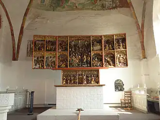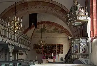 Het romaans-gotische kerkgebouw bezit een barokke kansel, een classicistisch orgel en een kostbaar gotische vleugelaltaar. De galerijen werden vanaf 1662 ingebouwd en in 1745 door de leraar Dierk Krüger uit Elmendorf beschilderd. De panelen zijn in originele staat bewaard gebleven en tonen scènes uit het Oude en Nieuwe Testament. Deels zijn de gebeurtenissen boven de schilderijen aangegeven; er onder staan de namen van de personen die de panelen financierden en op de galerij hun plaats hadden.