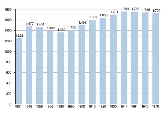 - Bronnen:NIS, Opm:1831 tot en met 1970=volkstellingen; 1976 = inwoneraantal op 31 december
