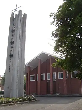 De zaalkerk, in de stijl van het naoorlogs modernisme, heeft een rechthoekige plattegrond en wordt gedekt door een zadeldak. De losstaande open klokkentoren werd gebouwd in 1966 en is van beton. Hij staat voor het kerkgebouw.