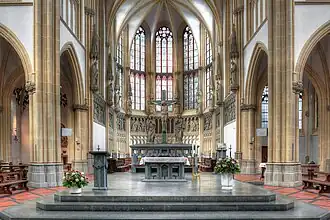 In de Tweede Wereldoorlog werd de door brandbommen getroffen kerk, met inbegrip van de 75 meter hoge torens, sterk beschadigd. Eind jaren 40 begon de herbouw van de kerk. De beide torens kregen echter niet haar tot 75 meter hoog oprijzende spitsen terug. Het dak van het kerkschip en dwarsschip werd aanmerkelijk lager hersteld. De vieringtoren en twee zijtorens werden niet herbouwd en de balusters die het dak omringden werden evenmin in de oorspronkelijke vorm hersteld.