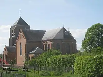 Het betreft een georiƫnteerde neogotische eenbeukige bakstenen kruiskerk. De voorgebouwde zware toren in Kempense gotiek van 1500 heeft vier geledingen en een tentdak. Het koor is driezijdig afgesloten.
