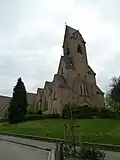 Het kerkgebouw is opgetrokken in geel baksteen en bestaat uit een westtoren met zadeldak, een schip met smalle zijbeuken en een koor. De kerk heeft elementen van neogotiek en zakelijk-expressionisme. In de kerk staat het Apolloniabeeld dat nog uit de oude kerk stamt samen met een reliek van de H. Apollonia.