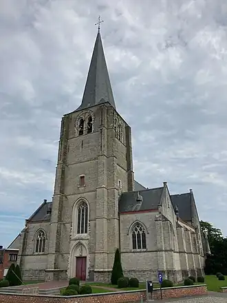 Het gebouw is een gotische, driebeukige kruiskerk, gebouwd uit zandstenen en afgewerkt met een leien bedaking. De westtoren is ingebouwd tussen de doopkapel en de bergruimte, aansluitend vindt men nog een driebeukig schip van drie traveeën. Het transept is niet uitspringend en heeft een vlakke sluiting, en een koor van drie rechte traveeën.
