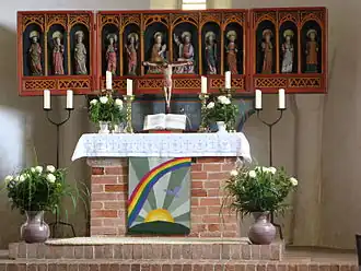 Het in de middeleeuwen gemetselde altaar heeft een retabel met houten beelden die op basis van stijlkenmerken in het derde kwart van de 15e eeuw worden gerangschikt. Op het altaar staan twee paren kandelaren, waarvan het oudste paar uit de late gotiek van rond 1500 dateert. Het jongere paar kandelaren zijn barok en werden in 1680 door Janes Petersen geschonken. Tussen de kandelaren staat een laatgotische crucifix uit het einde van de 15e eeuw.