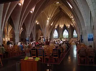 Opvallend zijn de gewelven die, hoewel gebaseerd op het traditionele kruisribgewelf, in een spitse vorm vanuit de lage pilaren oprijzen en daardoor een soort organische vorm aannemen. Het kerkmeubilair stamt voornamelijk uit 1960. Een Mariabeeld, gered uit het puin van de voorgaande kerk, is ouder, namelijk van de 19e eeuw.