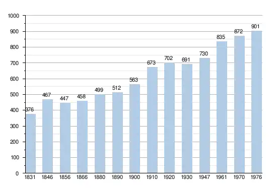 - Bronnen:NIS, Opm:1831 tot en met 1970=volkstellingen; 1976 = inwoneraantal op 31 december