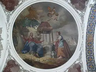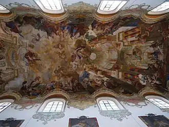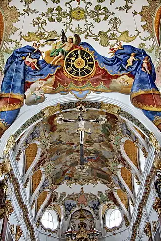 Tijdens de barokisering van het interieur van de kerk in de periode moest er rekening worden gehouden met het gezamenlijk gebruik van het hoofdschip van de kerk. Hier werd de kerk dus uitsluitend met beelden en fresco's met Bijbelse taferelen en de gezamenlijke hoogfeesten versierd. Het plafondfresco met voorstellingen uit het leven van Jezus werd door Johann Zich uit Lachen bij Ottobeuren geschilderd. Te zien zijn: de aanbidding van de herders en de wijzen uit het oosten, de besnijdenis van Jezus en de presentatie (links en rechts boven het altaar), de 12-jarige Jezus met de schriftgeleerden in de tempel (boven het altaar), de verrijzenis en de hemelvaart (links en rechts van de orgelgalerij) en als Pinksterenscène Maria en de discipelen (boven het orgel).