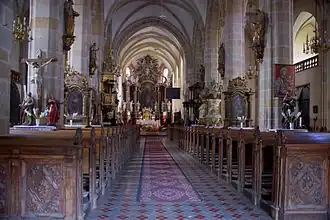 De indrukwekkende gotische kerk vormt het bewijs van het belang van de stad in de middeleeuwen. De kerk werd gebouwd op een heuvel ten noorden van de markt. De westelijke gevel is pronkvol en bezat ooit twee torens. Tegenwoordig is alleen de noordelijke toren nog aanwezig, de vierkante toren wordt boven achtzijdig en afgesloten met een tentdak. De zuidelijke toren stortte in 1533 in en werd slechts tot gevelhoogte herbouwd. Het gotische, spitsbogige portaal in de westelijke gevel ontstond in de 14e eeuw. Twee andere portalen bleven in de zuidelijke beuk bewaard. Naar de voorhal van het zijschip voert een maniëristisch portaal uit het eerste kwart van de 17e eeuw, geflankeerd door bas-reliëfs met de engelen, en naar het koor een gotische portaal uit circa 1400, met in het tympanon een beeld van de heilige Martinus op het paard die zijn mantel met een bedelaar deelt. Ten noorden van het koor bevindt zich de sacristie met daarboven een galerij die zich door arcaden naar het koor en het noordelijk zijschip opent.
