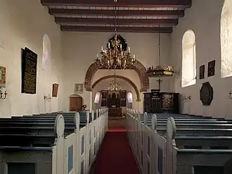 Het kerkschip en het koor worden met een houten zoldering afgesloten, de apsis heeft daarentegen een half koepelgewelf. De apsis wordt gescheiden van het koor door een rondboog van baksteen. Een rondboog markeert ook de overgang van het kerkschip naar het koor. De noordelijke galerij uit 1684 werd bij een restauratie in de jaren 1931-1933 verwijderd. De westelijke galerij bleef echter bewaard. Ook werden in 1932 de banken uit de koorruimte verwijderd, werd de kansel naar de rand van het koor verschoven en het doopvont op de huidige plaats opgesteld.