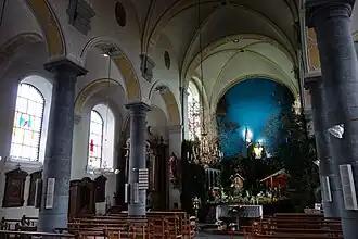 Binnen in het gebouw worden de zijbeuken van de middenbeuk gescheiden door middel van een rondboogarcade op zuilen van kalksteen met lijstkapiteel en rechthoekige sokkel. Tussen de toren en het schip bevindt zich een rondboogvormige doorgang. De middenbeuk en de zijbeuken worden overwelft door kruisribgewelven tussen rondbooggordelbogen en in de middenbeuk geschraagd door gesculpteerde consoles. Het koor wordt overwelft door een kruisribgewelf boven de rechte koortravee en een straalgewelf boven de koorsluiting.
