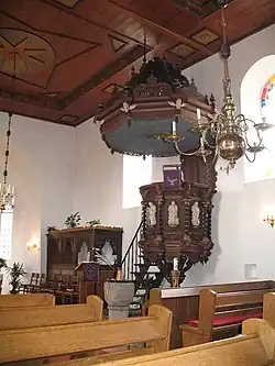 De barokke houten kansel van 1737 stamt uit het atelier van de school van Andreas Schnörwange. Een beeld van Mozes draagt de kuip, die tussen de gedraaide zuiltjes versierd is met de beelden van de vier evangelisten en de apostel Paulus.