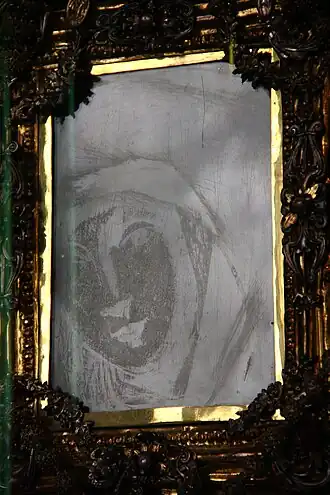 De bedevaart gaat terug op een gebeurtenis op 17 januari 1797, toen er volgens het oudste document over het genadebeeld op een raam van een boerenwoning een niet door mensenhanden getekende afbeelding van een vrouwenhoofd verscheen. Het was de 18-jarige dochter van het boerengezin, Rosina Bucher, die de afbeelding als eerste ontdekte. De afbeelding heeft geen kleuren, lijkt op een kopergravure en werd direct als een beeltenis van de Heilige Maagd geïdentificeerd. De afbeelding bleef na de ontdekking zichtbaar, dag en nacht en ongeacht of de kamer nu verwarmd of onverwarmd was. Zelfs nadat het raam aan beide zijden werd gewassen en weer schoon leek, verscheen er even later in het midden van het raam een kleine vlek, die zich uitbreidde over de rest van het raam totdat de beeltenis van Maria weer volledig hersteld was. Het wegwassen en terugkomen van de beeltenis herhaalde zich nadat op verzoek van de familie verschillende geestelijken dit verschijnsel met eigen ogen kwamen vaststellen. Nadat pelgrims en nieuwsgierigen uit omliggende plaatsen naar de beeltenis kwamen, werd het raam ingepakt, verzegeld en naar Innsbruck verzonden om door een sceptische commissie te worden onderzocht. Op 24 maart 1797 keerde het raam ten slotte naar Absam terug en onder het luiden van klokken in processie naar de kerk gebracht. Sindsdien wordt het miraculeuze raam als een genadebeeld in de kerk vereerd. Buiten werd boven het portaal een kopie van de afbeelding aangebracht.[1][2]