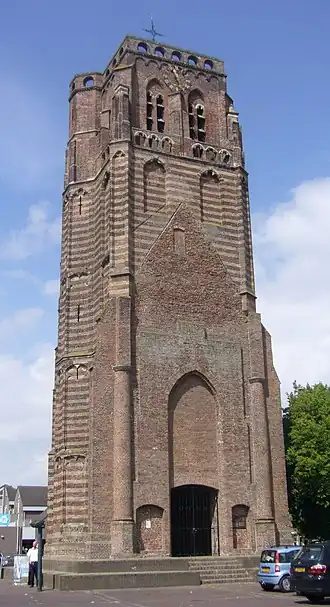 - De Oude toren. Deze dateert uit het midden van de 15e eeuw en is gerestaureerd in 1936. Ze kenmerkt zich door speklagen van baksteen, afgewisseld met tufsteen. Alleen de bovenste geleding, waar de klokken hangen, is geheel uit baksteen opgetrokken. Er zijn overhoekse steunberen en, evenals de torenromp, versierd met spaarvelden. De toren heeft een aangebouwde traptoren, maar ze is stomp aangezien de spits in 1836 afgewaaid is en nimmer herbouwd. De toren is beeldbepalend voor het dorp.