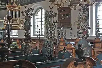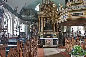 De barokke inrichting van de kerk stamt voornamelijk uit de 16e eeuw. De beide galerijen links en rechts van het altaar en de vrouwengalerij onder het orgel vullen de ruimte aan. Het blauw geverfde houten tongewelf is versierd met onregelmatig aangebrachte goudkleurige sterren. Het hoge altaar bevat twee schilderijen van de Kruisiging en het Laatste Avondmaal.