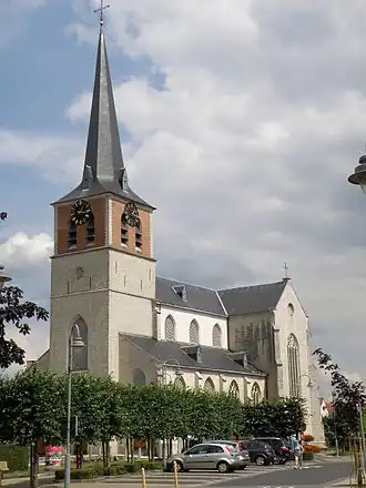 Het betreft een in Gobertanger witsteen uitgevierde driebeukige basilicale kruiskerk, die georiƫnteerd is. Het koor is driezijdig gesloten, de zijkoren zijn vlak afgesloten. De bovenste torengeleding werd in baksteen uitgevoerd.