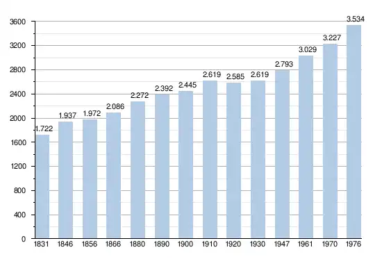- Bronnen:NIS, Opm:1831 tot en met 1970=volkstellingen; 1976 = inwoneraantal op 31 december