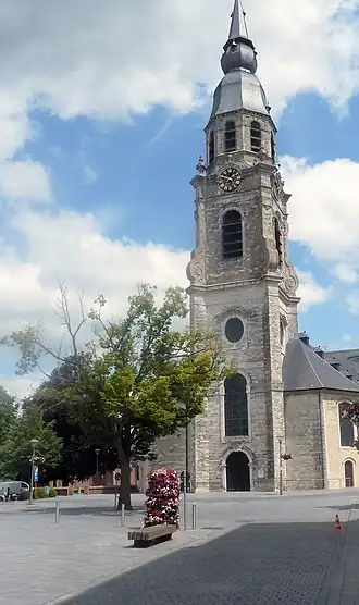 In de oostelijke muur van het zuidelijke transept zijn nog resten van de 12e-eeuwse kerk te vinden in Doornikse steen. Het gotisch koor is uit het begin van de 15e eeuw. Het noordelijk transept, ook in gotische stijl, is van 1640-1642. De in barokstijl uitgevoerde toren is van 1665-1689, Van 1742-1755 werd de kerk vergroot waarbij het kerkschip en de zijbeuken in classicistische stijl werden uitgevoerd.