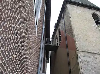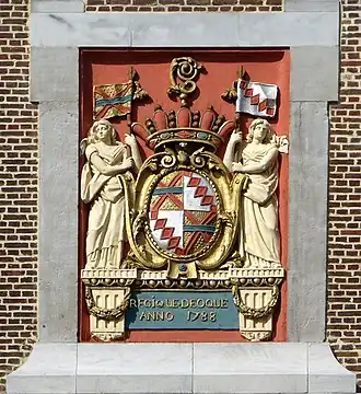 In de hoge voorgevel is boven het portaal het wapenschild van abdis Augustina van Hamme aangebracht. Daarboven bevindt zich in een rondbogige nis het beeld van de heilige Quintinus.