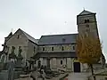 Het gebouw is een romaanse met een westtoren, een schip, een viering met transepten en een ronde apsis.