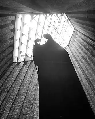 De toegang tot de kerk is door een bijna 5 meter hoge en 10 meter brede luifel, die aan beide kanten ondersteund wordt door gewapend betonnen wanden.
