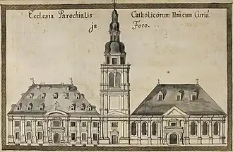 In het midden van het raadhuis en de kerk staat de klokkentoren. De verbinding tussen de wereldse macht met de religie wordt door het inschrift Iustitiae et Pietati (gerechtigheid en toewijding) in grote gouden letters over de gevels van alle drie de bouwdelen benadrukt. Beide gevels worden bekroond met de corresponderende beelden van deugden in de figuren van vrouwen (gerechtigheid en geloof). De symmetrie van het complex wordt verder versterkt door de portalen. Het portaal van het raadhuis is versierd met atlanten en dat van de kerk met engelen. Het balkon boven het kerkportaal is slechts voor de sier en kan niet worden betreden.