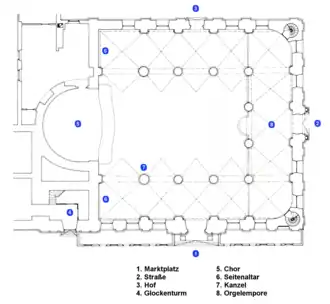 Samen met het Oude Raadhuis beheerst de kerk de zuidelijke rand van het Marktplein. Tot de Tweede Wereldoorlog omzoomden gebouwen in de stijl van de barok, het classicisme en het historisme het plein. Vrijwel alle bebouwing aan het plein werd in de oorlog vernietigd en later door gebouwen met een woon- en winkelbestemming in de functionele naoorlogse stijl vervangen. De barokke dubbelbouw van raadhuis en kerk bleven echter staan en vormen zo met de in 1767 onthulde bron op het Marktplein een contrast met de naoorlogse bebouwing.