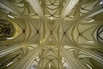De kerk werd een vijfschepig, vier traveeën lang schip met twee transepten in het oosten en westen. Het romaanse grondplan bleef grotendeels bewaard en mogelijk werden zelfs de oude fundamenten bij de nieuwbouw gebruikt. Men voegde echter zowel in het noorden als in het zuiden een tweede zijschip toe, waardoor de hele kerk dezelfde breedte als de dwarsschepen kreeg. De gewelven uit circa 1370 lijken even hoog te zijn, hetgeen de eenheid van de bouw binnen ten goede komt. Hier heeft men op het romaanse grondplan tijdens de hooggotiek een voor die tijd zeer ongewoon type kerkgebouw opgericht, dat eigenlijk pas in de 15e eeuw met de opkomst van de laatgotische hallenkerken in zwang raakte. De Mariakapel aan de noordelijke zijde werd tegelijkertijd met de kerk en de voorbouw van het hoofdportaal gebouwd (Het beeld met Maria en kind dateert van 1360-1370).