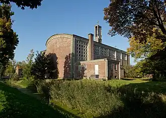 De katholieken moesten hun toevlucht zoeken tot een noodkerk om in 1957 een nieuwe kerk in gebruik te nemen. Deze werd ontworpen door Johannes van Halteren.