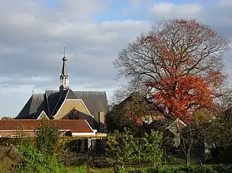 Links van de kerk staat de pastorie. Rechts naast de kerk loopt een pad naar het achtergelegen kerkhof.