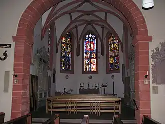 Het gotische koor, dat een 5/8 afsluiting, tweedelige maaswerkramen en een netribgewelf heeft, wordt tegenwoordig als doopkapel en voor doordeweekse vieringen gebruikt. De gebrandschilderde ramen werd in 1964 door Valentin Feuerstein gemaakt en tonen motieven uit het Oude en Nieuwe Testament.